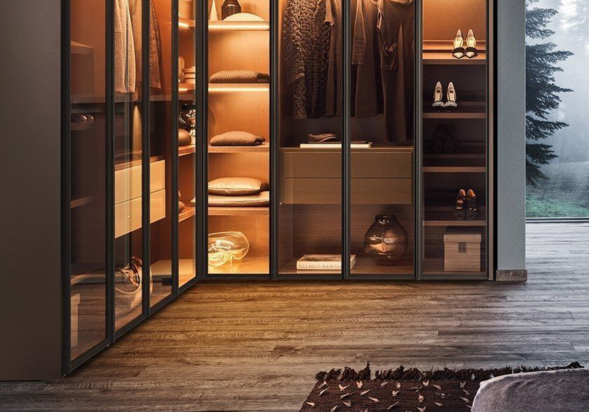Встроенная гардеробная предусматривает установку практически без зазоров в нишу или комнату. Обычно отсутствует пол и верхняя часть завершена большой антресольной полкой. При такой конструкции важны миллиметры и зависит качество её монтажа от правильно проведённого замера.